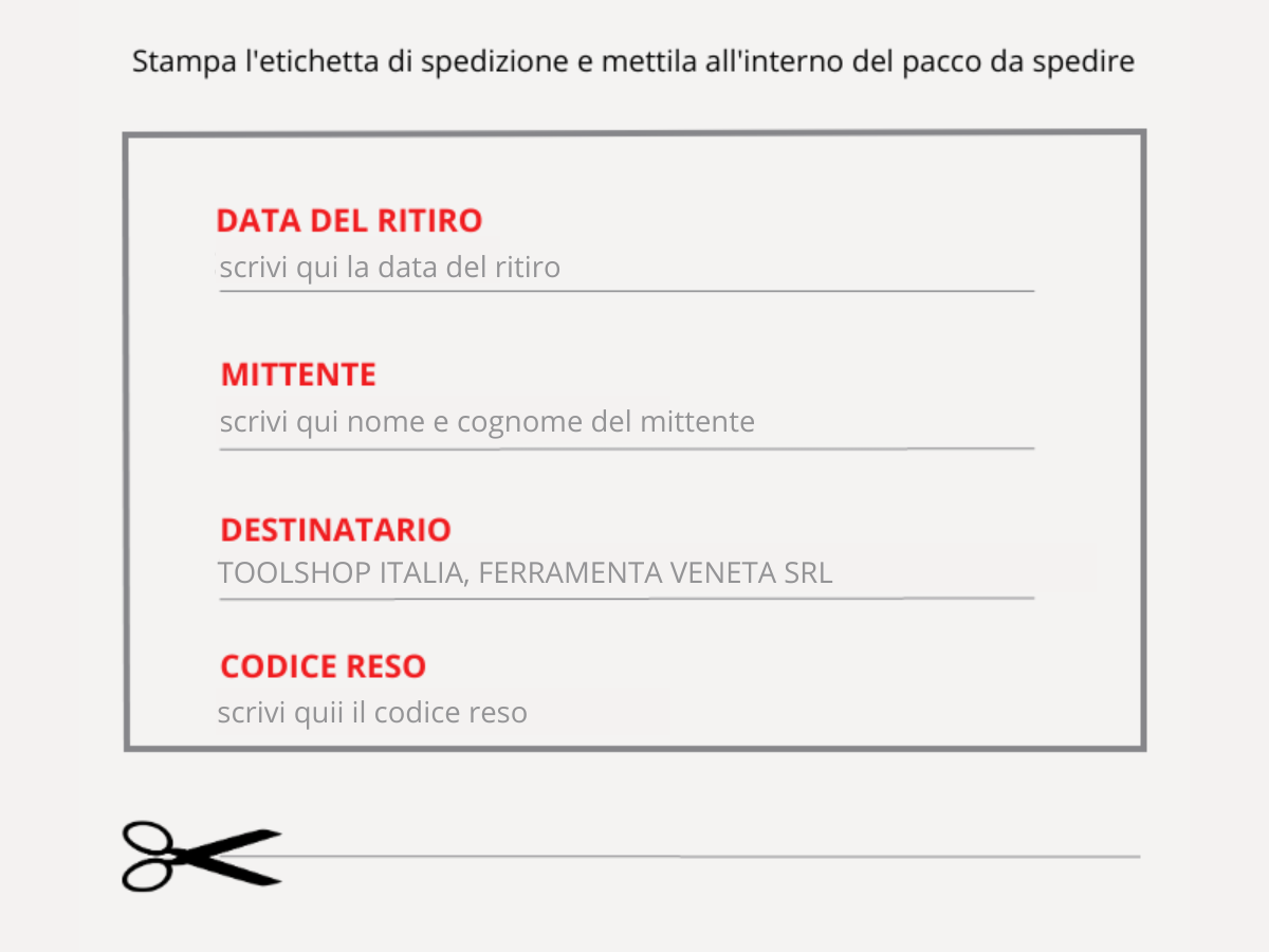 Riceverai una mail di conferma ritiro merce e la relativa ETICHETTA DI RESO da stampare e inserire nel pacco.