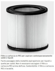- L’aspiratore è equipaggiato con filtro a cartuccia. Un galleggiante meccanico interrompe l'aspirazione quando il livello nel vano raccolta è alla massima altezza, garantendo una maggiore durata ed un lavoro più sicuro.
