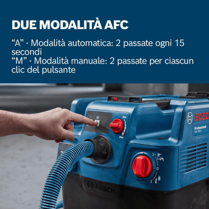 - GAS 400 A Professional risparmia tempo prevenendo l'intasamento del filtro, grazie all'esclusiva tecnologia Automatic Filter Cleaning (AFC) Bosch.