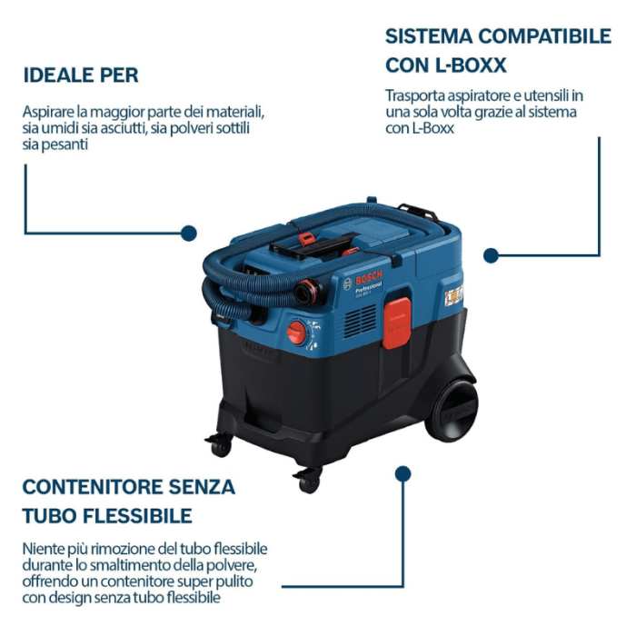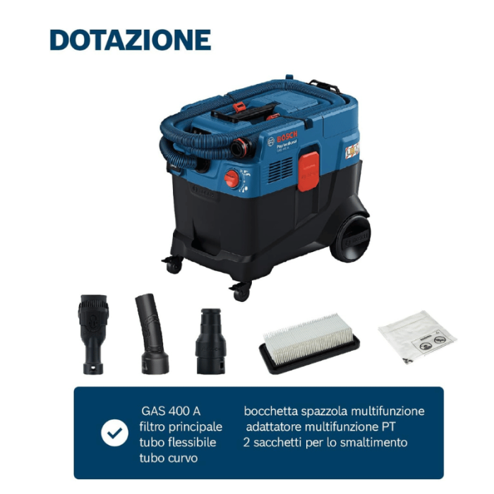 - Bosch GAS 400 A Professional rimuove la maggior parte dei materiali, come polveri fini e pesanti, bagnate e asciutte.