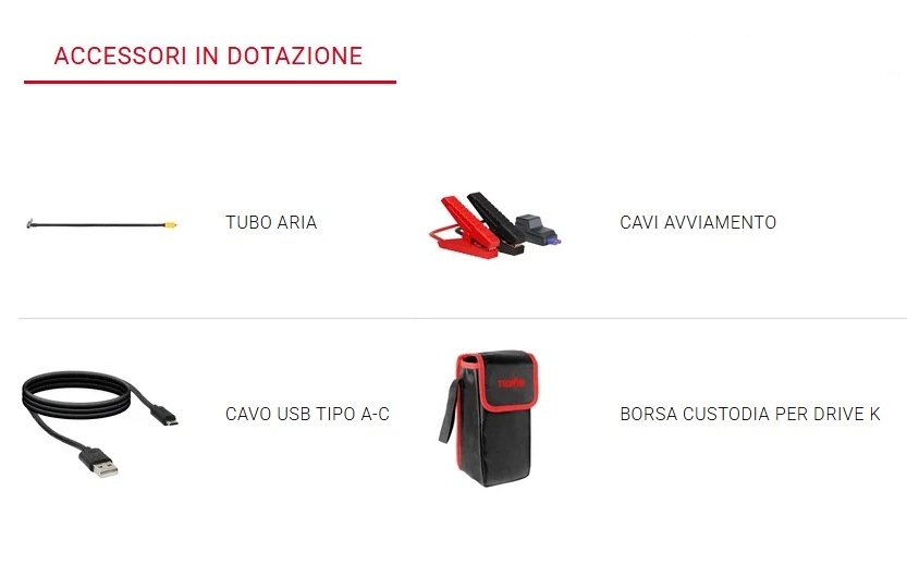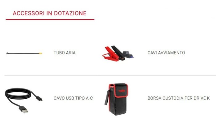 Completo di cavi di avviamento, cavo di collegamento per ricarica (USB C), tubo d’aria rimovibile, 3 ugelli per il gonfiaggio e pratica custodia per riporlo.