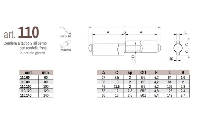 - Cerniere a saldare 2 ali in acciaio grezzo perno fisso Combi 110 - mm 60