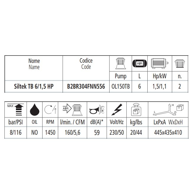 - Compressore aria silenzioso oilless 59dB 6 litri Fini Siltek TB 6/1,5 Hp