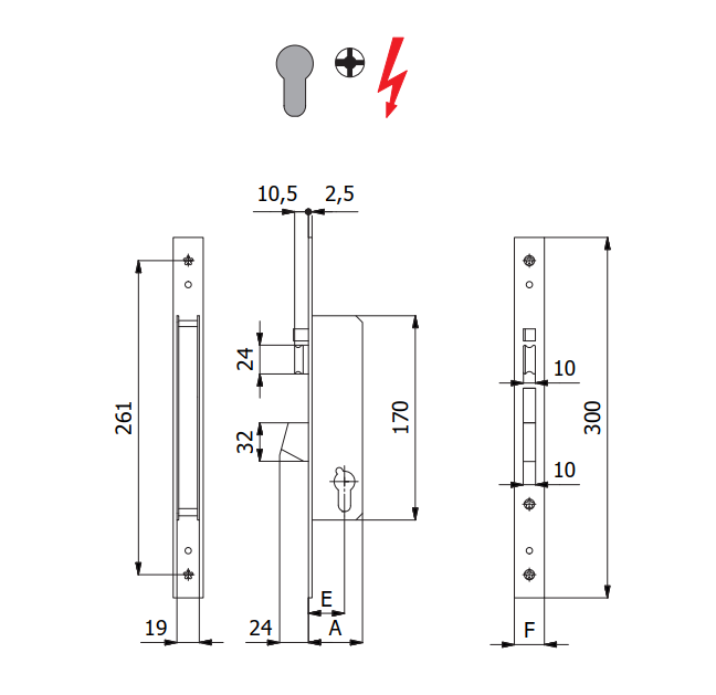 - Catenaccio comandato dalla chiave - Scrocco comandato dalla chiave, dal comando elettrico a distanza o dal pulsante meccanico cod. 058 - Il funzionamento è garantito anche in mancanza di corrente.