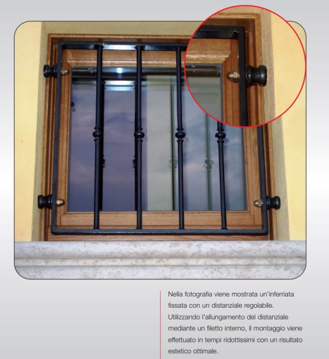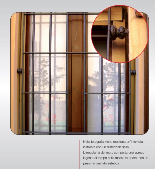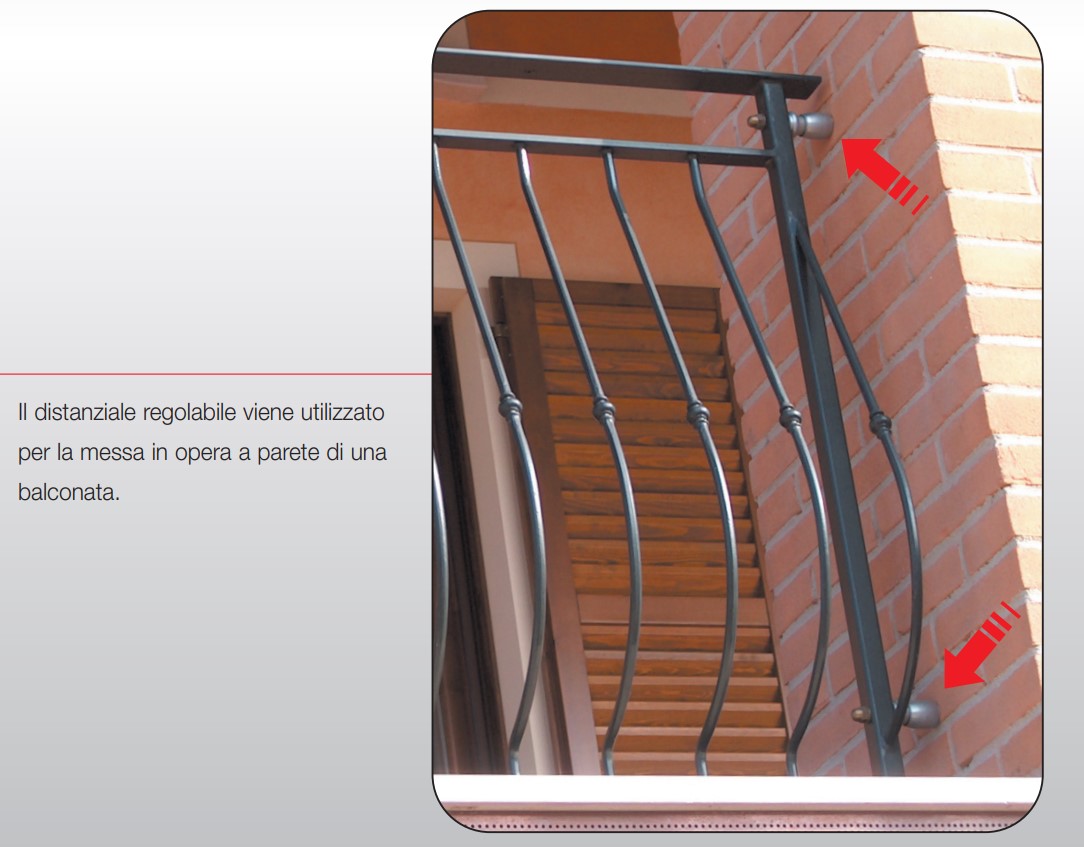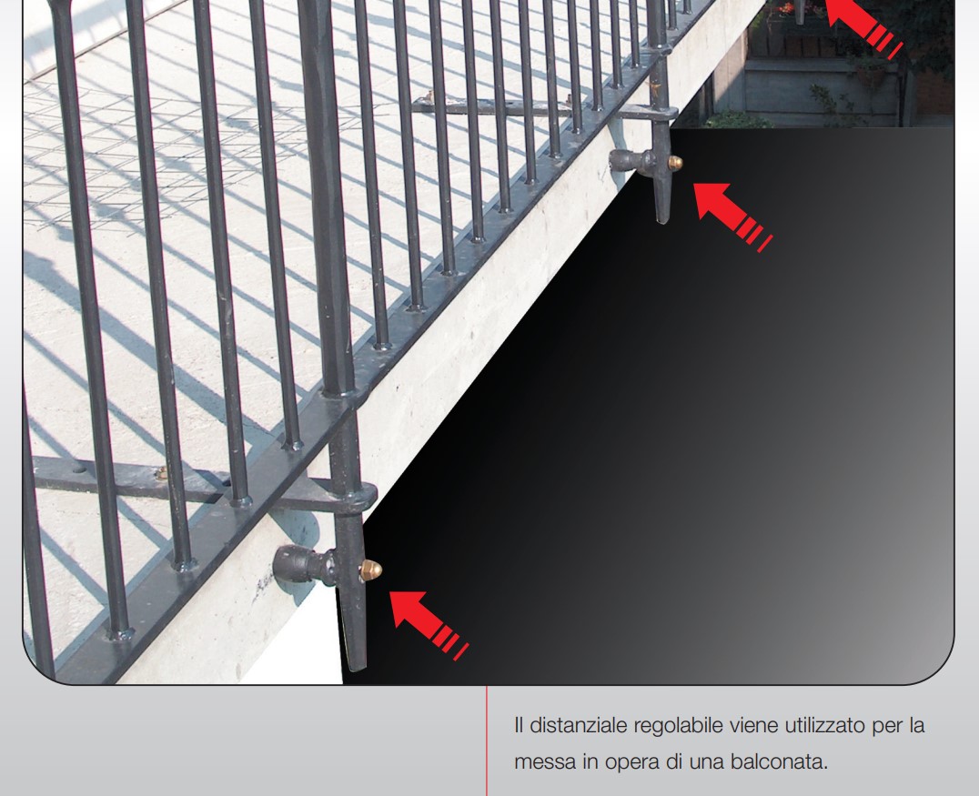 - Il distanziale regolabile è nato per ovviare ai molteplici problemi che si presentano durante l’installazione di strutture in metallo come inferiate, ringhiere, cancelli, scale, balconi, posti in vani di cemento.