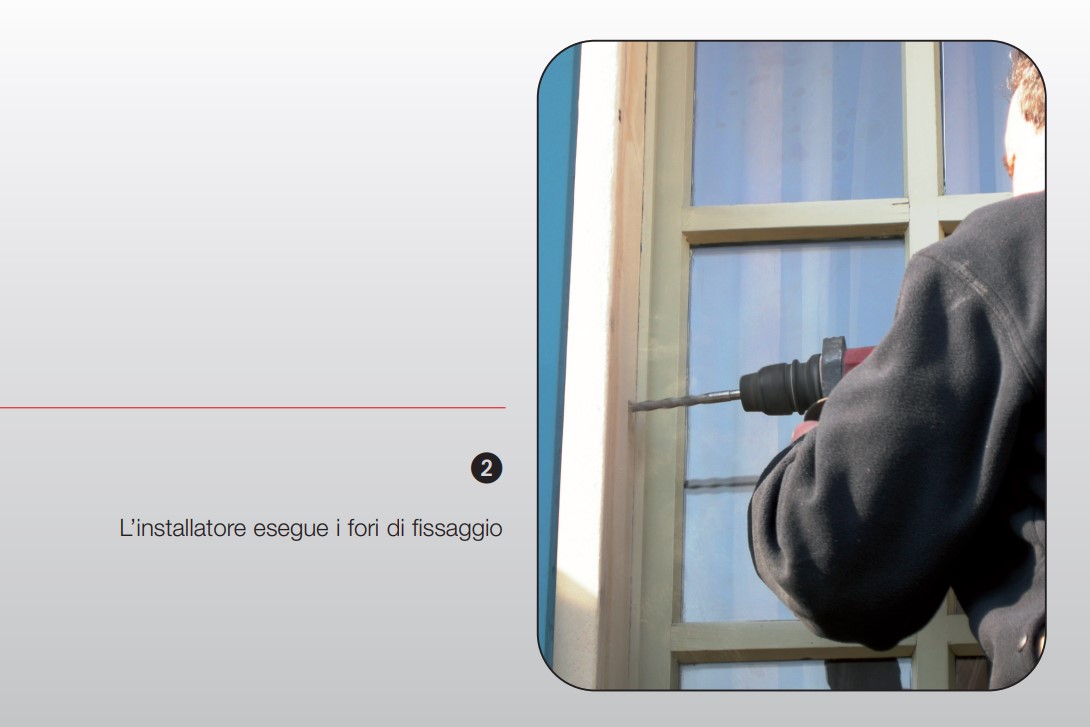 - Una volta centrata la struttura in ferro, essa verrà fissata con tasselli standard passanti nel distanziale.