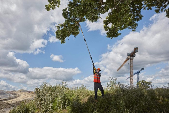 - Il suo palo estensibile con una portata totale di 4,5 m consente di tagliare rapidamente e facilmente.