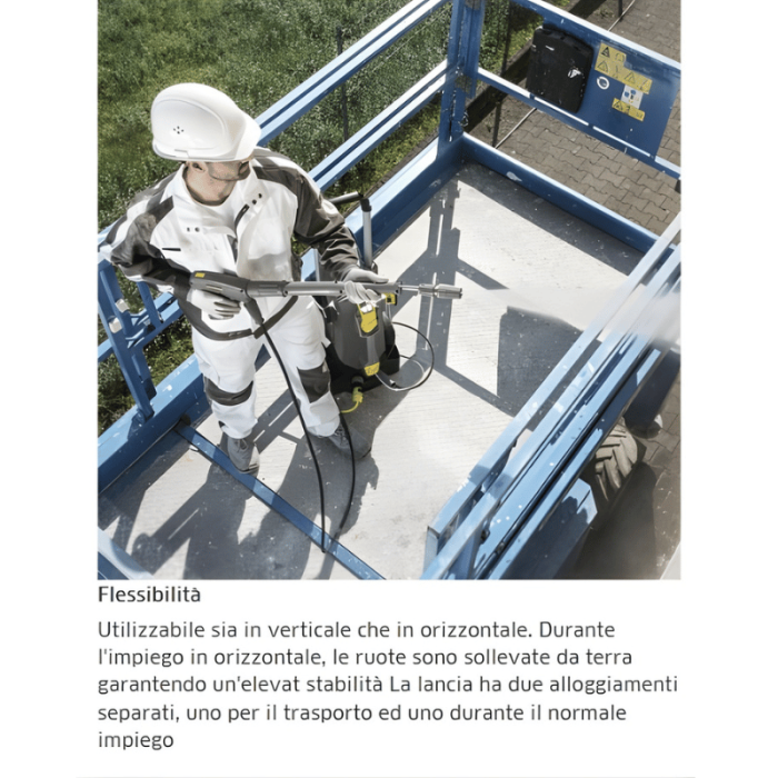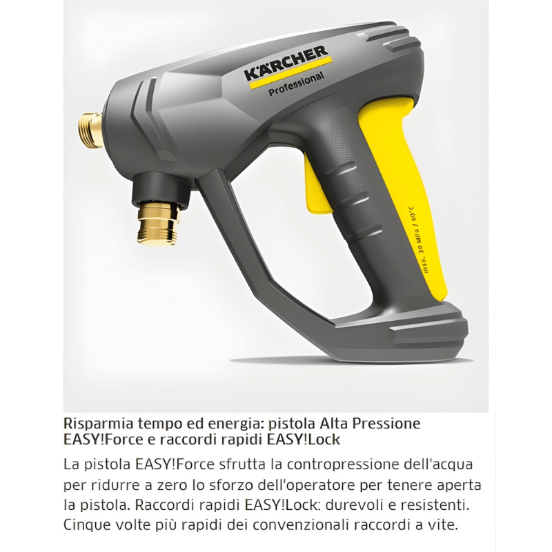 E' stata progettata per una lunga vita grazie alla testata in ottone con pistoni in acciaio e allo scarico automatico della pressione. Le innovazioni apportate agli accessori dimezzano i tempi di montaggio e smontaggio: mentre la pistola EASY!Force sfrutta la contropressione in uscita dalla lancia per ridurre a zero la fatica dell'operatore, i raccordi rapidi EASY!Lock sono cinque volte più rapidi dei convenzionali raccordi a vite e sono robusti e durevoli.