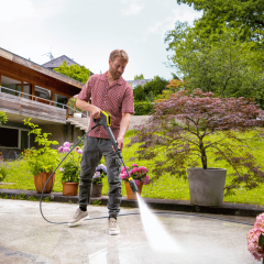 Grazie al sistema Quick Connect, il tubo ad alta pressione può essere collegato rapidamente e senza sforzo, e l'innovativa lancia multigetto 4 in 1 combina 4 diversi tipi di getto che possono essere comodamente regolati ruotando la lancia.