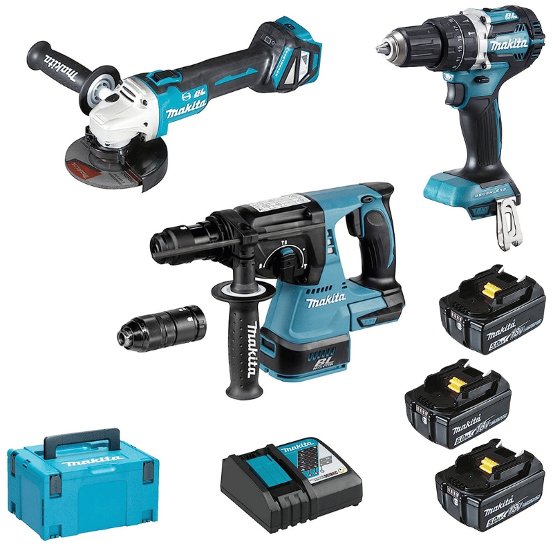 - tassellatore DHR243Z, smerigliatrice DGA513Z, avvitatore DHP484Z, 3 batterie BL1850B, caricatore DC18RC, valigetta Makpac tipo 3 e valigetta Makpac tipo 4