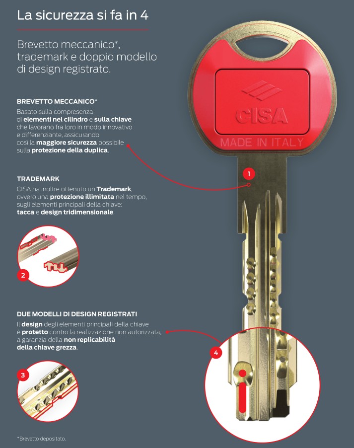 Nuova, iconica, elegante, la chiave è coperta da 4 forme di protezione brevettuali a tutela delle dupliche non autorizzate.