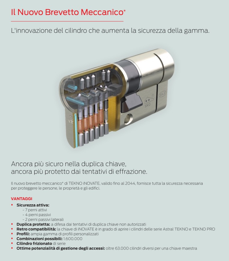 Il nuovo brevetto meccanico di TEKNO iNOVATE, valido fino al 2044, fornisce tutta la sicurezza necessaria per proteggere le persone, le proprietà e gli edifici.