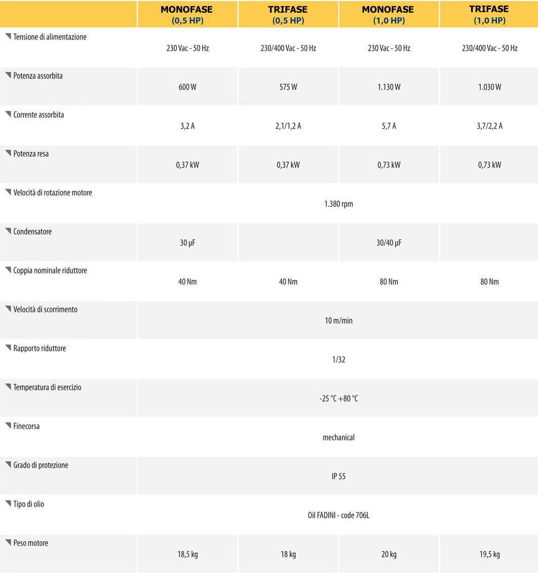 motoriduttore con accoppiamento bronzo-acciaio in bagno d’olio il tutto supportato da cuscinetti a sfera di altissima qualità ed affidabilità. Diverse tipologie di motori elettrici.