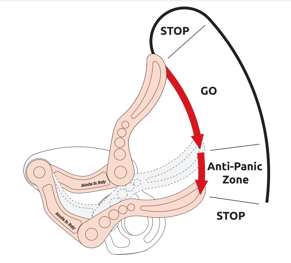 - Camma dotata di prolungamento con grilletto, per consentire un rapido scorrimento della corda in situazioni di carico limitato o assente.