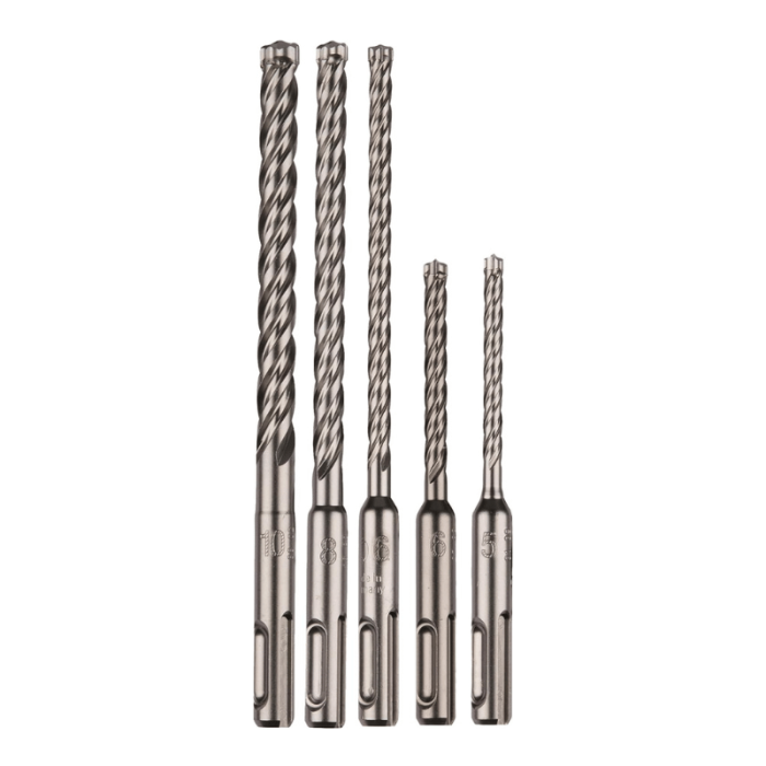 Set da 5 punte a 4 taglienti per foratura a percussione con testa della punta dinamica e geometria di taglio unica.
