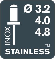 E' progettata per rivetti a strappo da 3,2–4,8 mm di tutti i materiali, anche i più duri come quelli in acciaio INOX. Tra le altre funzioni c'è il gancio per cintura e un raccoglitore per i perni di scarto.