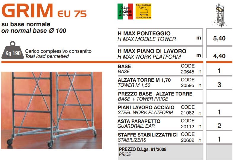 - Costruito in conformità alla normativa europea UNI EN 1004, al D.Lgs. 81/2008 (tsto unico sicurezza Art.140) a al D.Lgs. 206/2008 (codice del consumo Art.2).