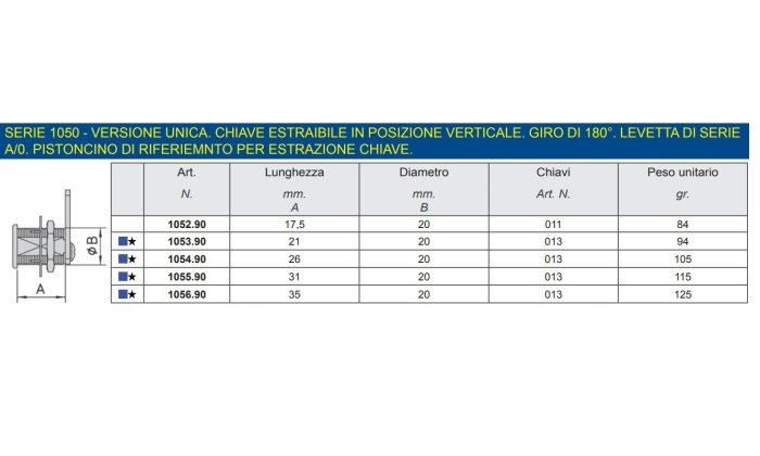 Serratura universale per mobili con chiave estraibile in posizione verticale serie 1050 Viro