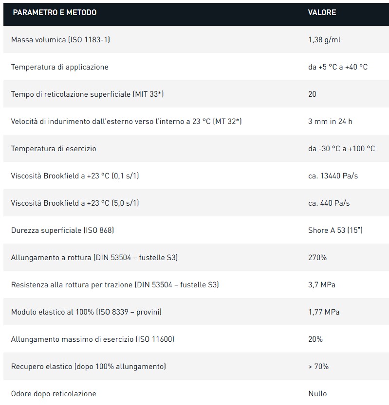 Indurisce rapidamente per reazione con l’umidità dell’aria, o con l’acqua stessa, formando una massa permanentemente elastica da -30 a +100 °C, che assorbe le vibrazioni e isola acusticamente gli elementi incollati.