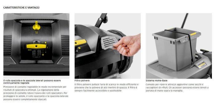 Il filtro utilizzato rende lo spazzamento praticamente privo di polvere. Una maniglia regolabile in altezza e il sistema Home Base per il trasporto di attrezzature aggiuntive come benne e raccoglitori di rifiuti garantiscono un funzionamento ergonomico. Ciò significa che i rifiuti possono essere smaltiti insieme a polvere e sporcizia in un unico passaggio. Quando il lavoro è terminato il KM 70/20 C 2SB può essere riposto in modo salvaspazio nella sua posizione di parcheggio.