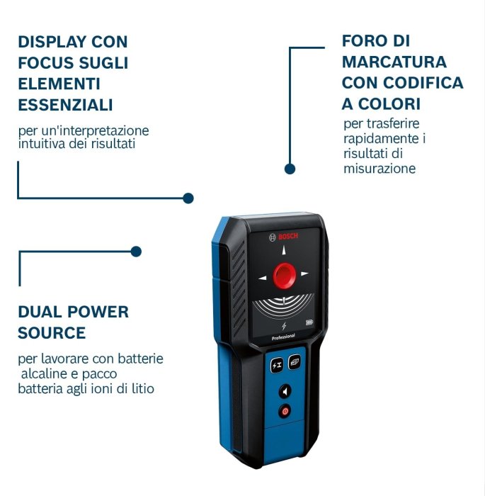 Questo scanner non solo identifica il centro dell’oggetto rilevato, ma indica anche le caratteristiche del materiale, ad esempio se si tratta di un oggetto in metallo magnetico o non magnetico, di un cavo sotto tensione o di un materiale non metallico.