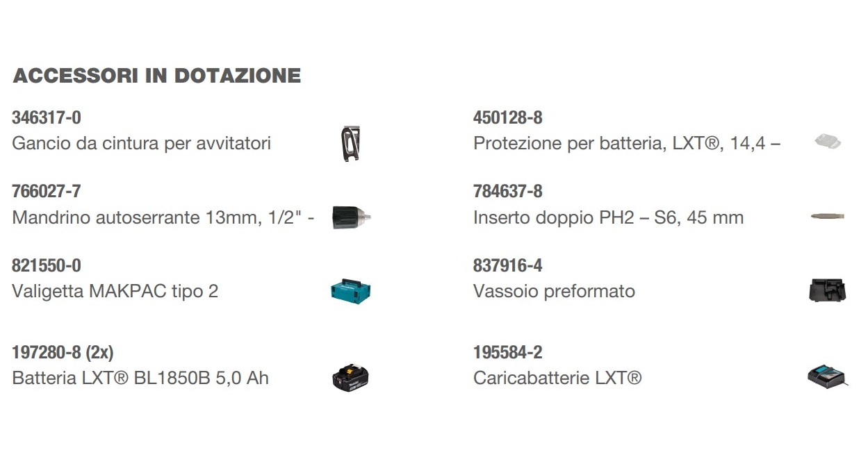 Fornito con 2 batterie 5,0 Ah BL1850B, caricabatterie rapido 45' DC18RC, valigetta MAKPAC tipo 2 (821550-0)