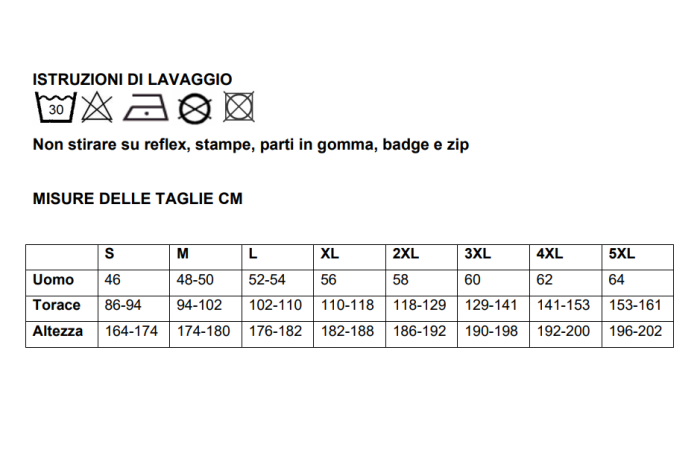 Tenere in un luogo asciutto e fresco, nell’imballaggio d’origine, al riparo dalla luce, dall’umidità e dalle polveri. I capi impermeabili non devono essere forati o spillati.