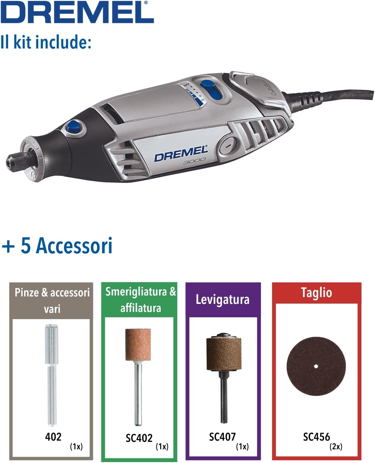 - Questo kit comprende un DREMEL 3000 e 5 accessori originali Dremel.