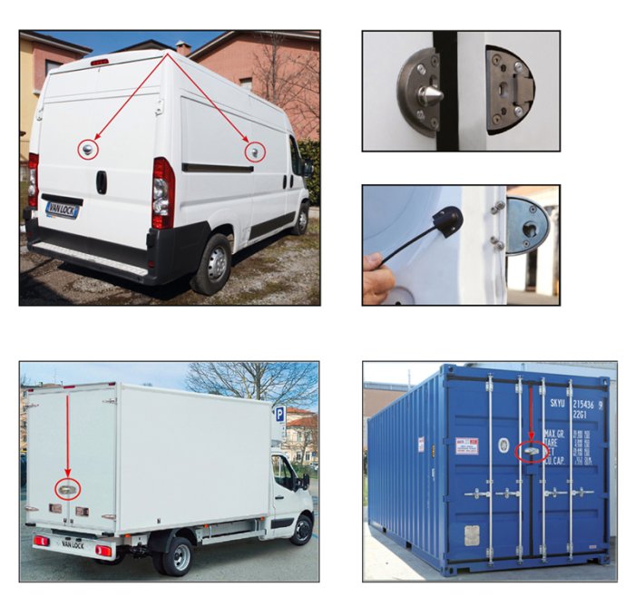VAN LOCK, installabile praticamente in ogni situazione (grazie all'accessorio art. 4222.2035 anche su container utilizzati come depositi merci), in quanto tollera o recupera (con spessori) eventuali disallineamenti delle ante.